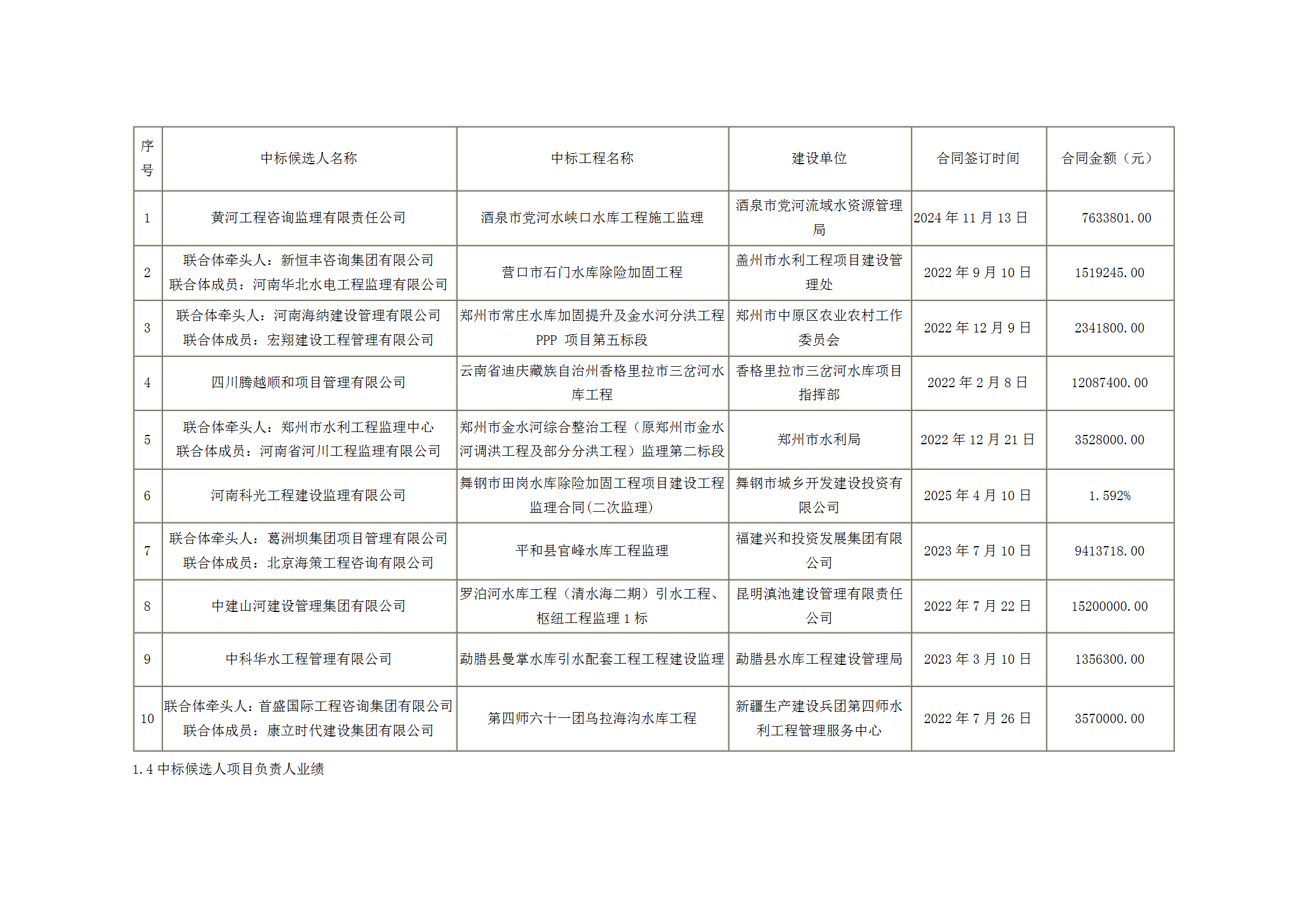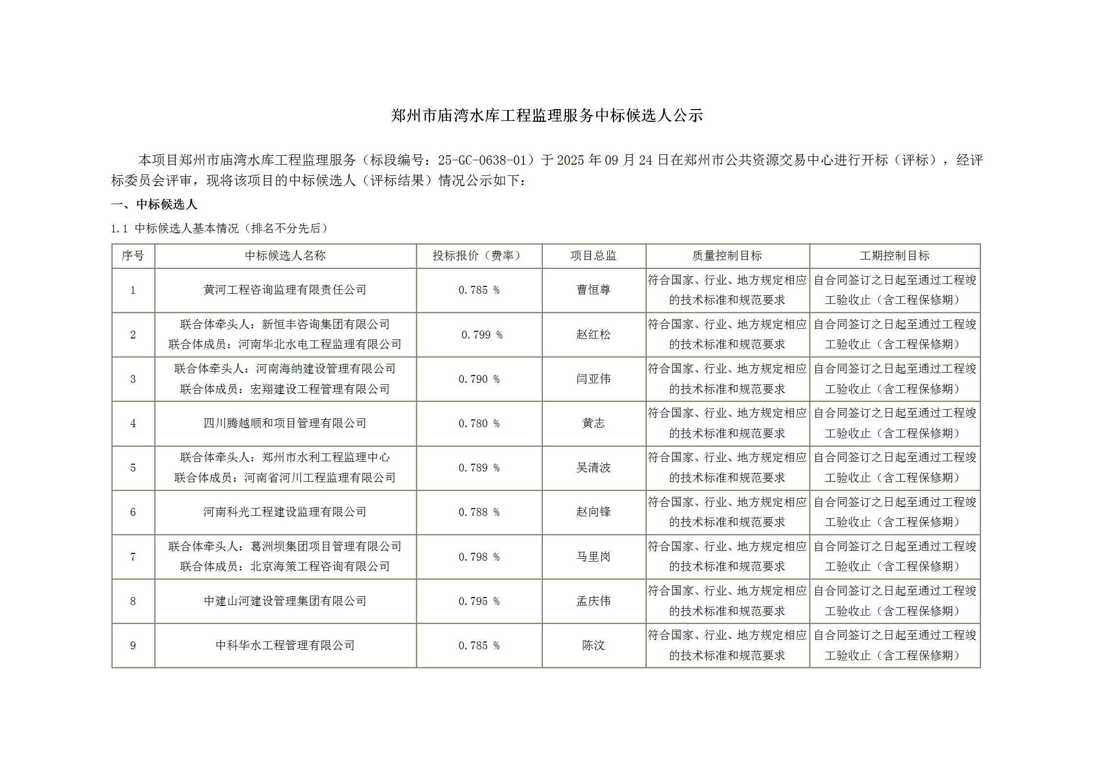 鄭州市廟灣水庫工程監理服務中標候選人公示